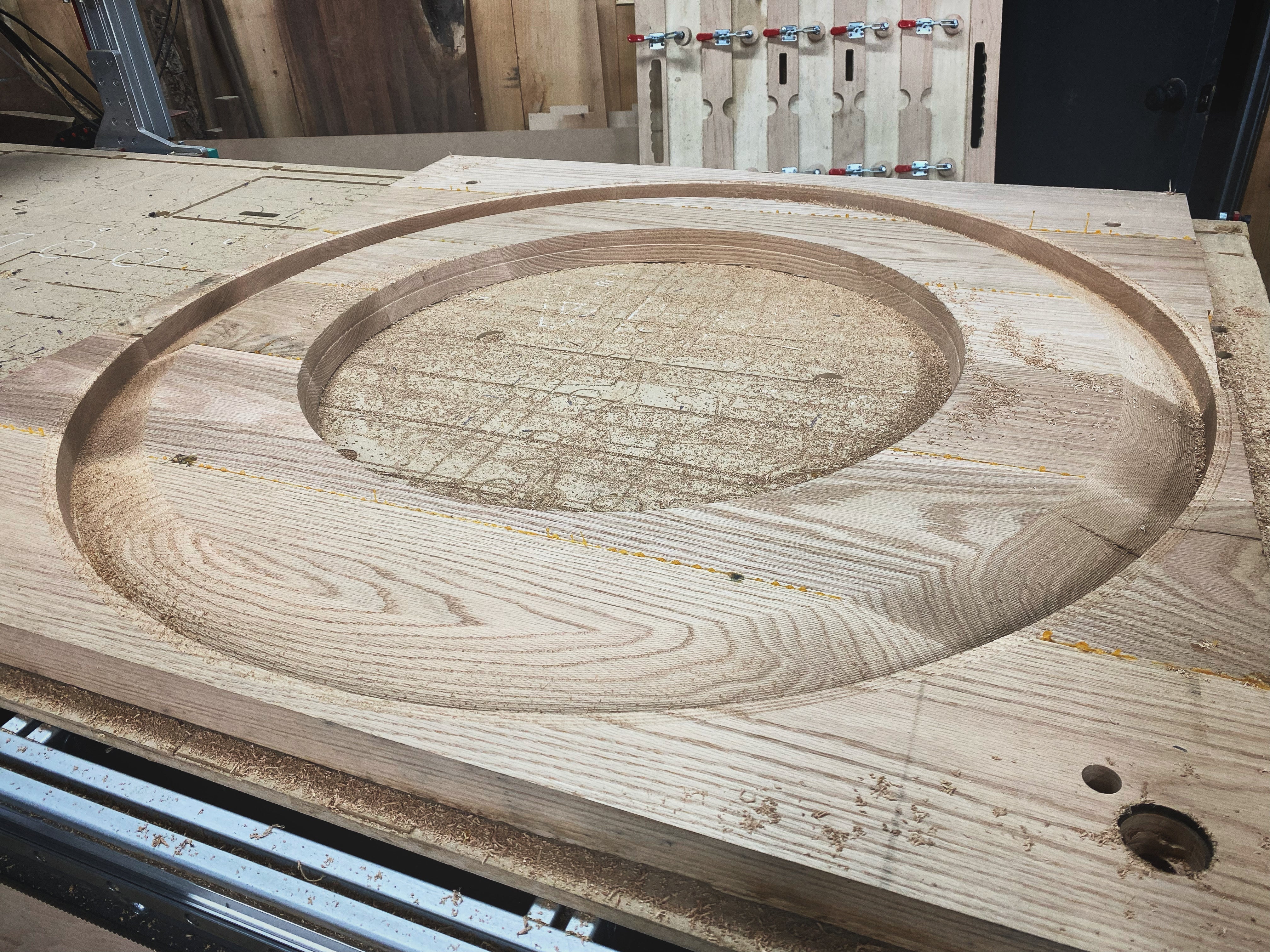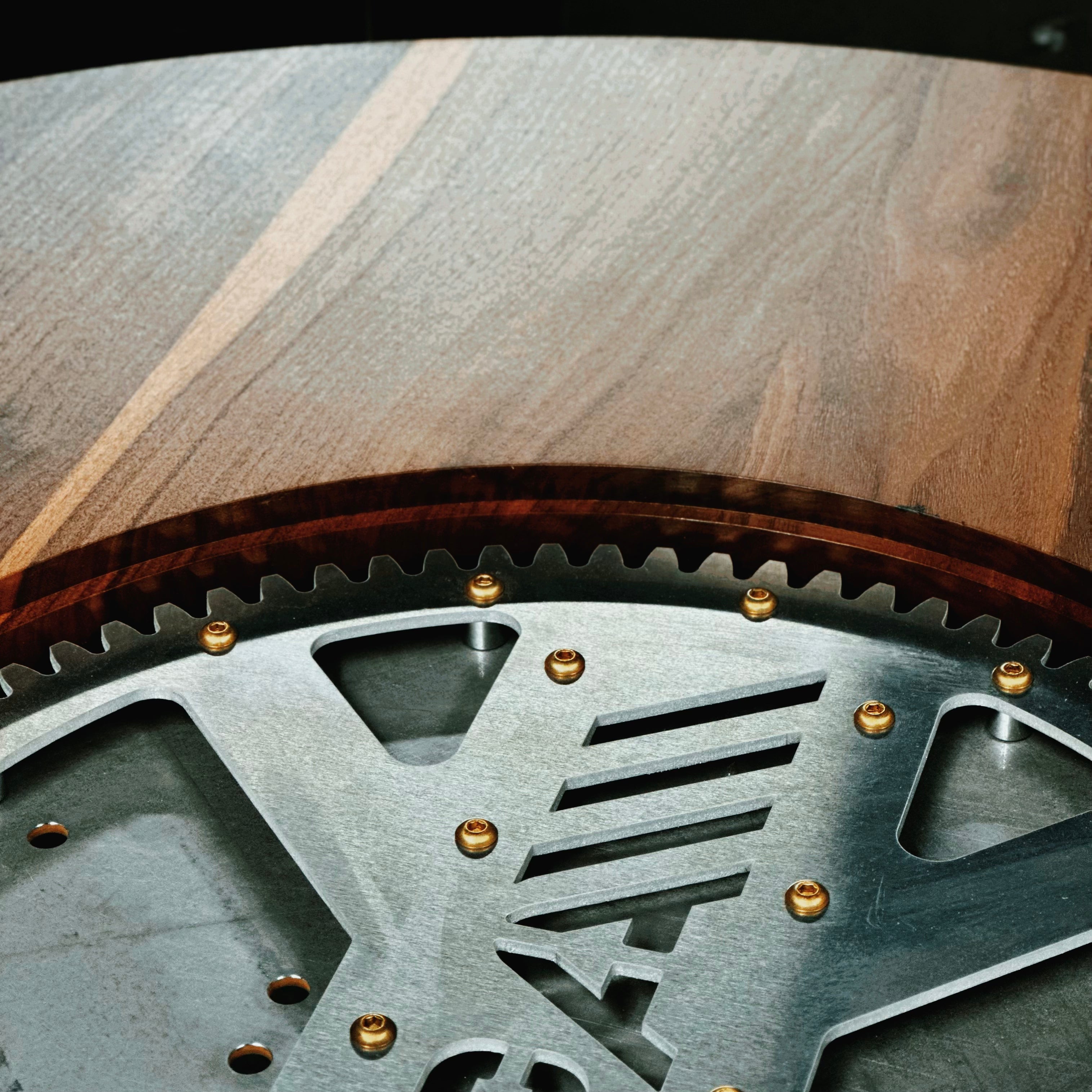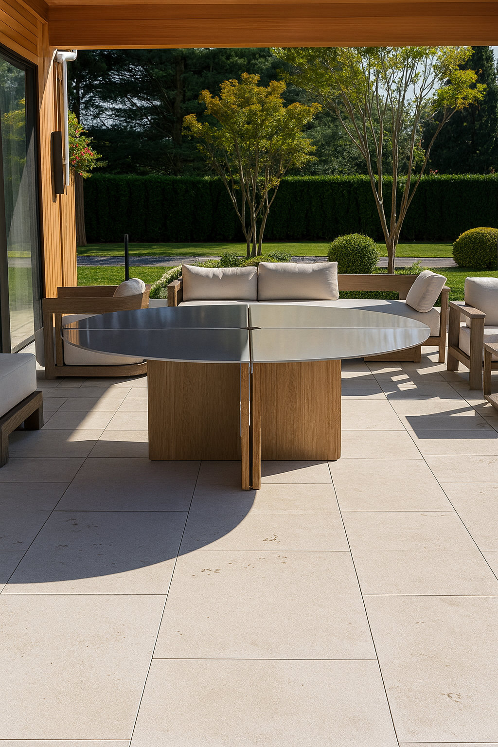 This custom outdoor table built by Formhaus for a client in Southampton, NY. The piece features a solid white oak base with intersecting panels that form a sculptural foundation, supporting a precision-cut round aluminum top (provided by bestcase.co) finished for outdoor durability.