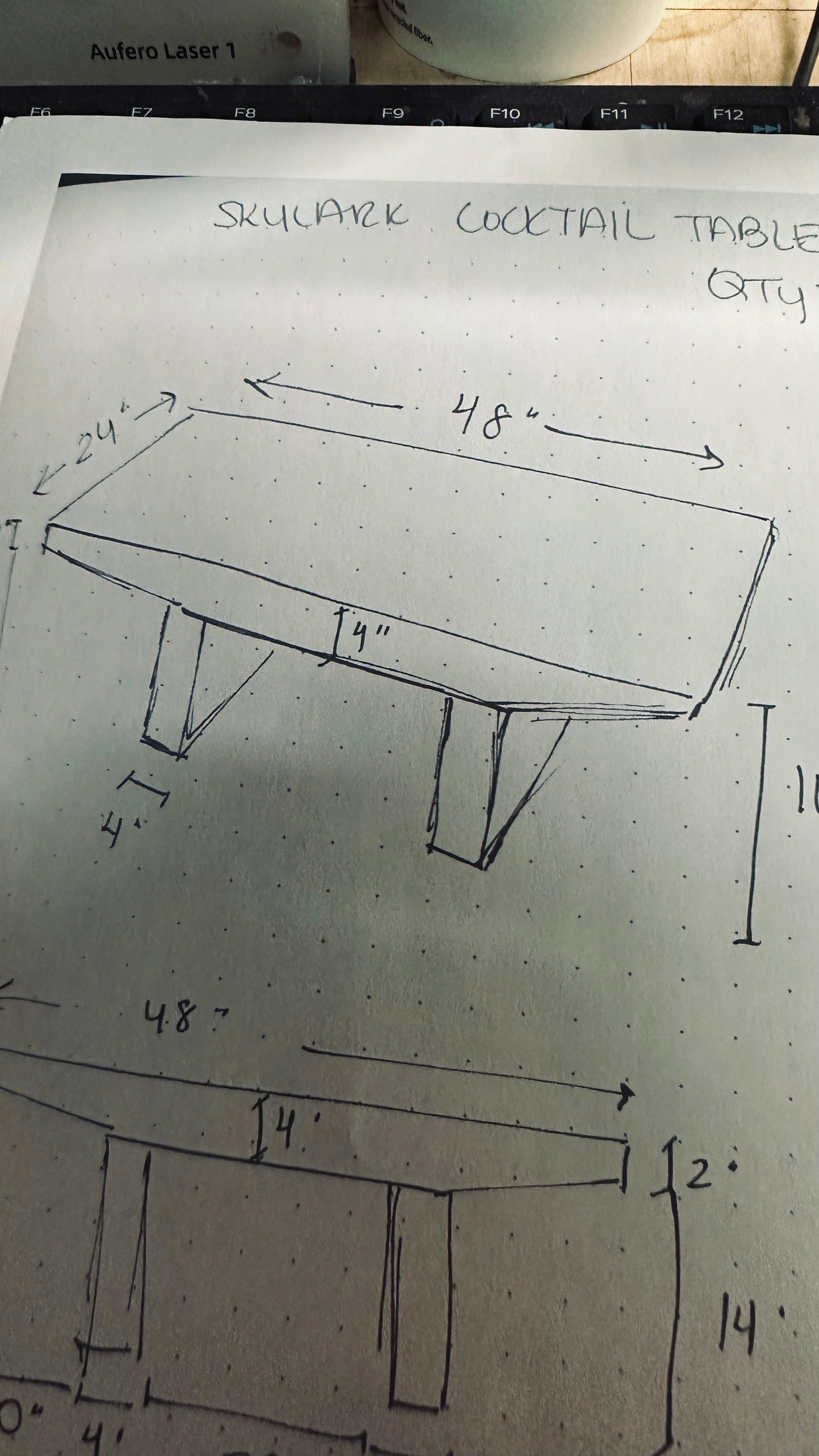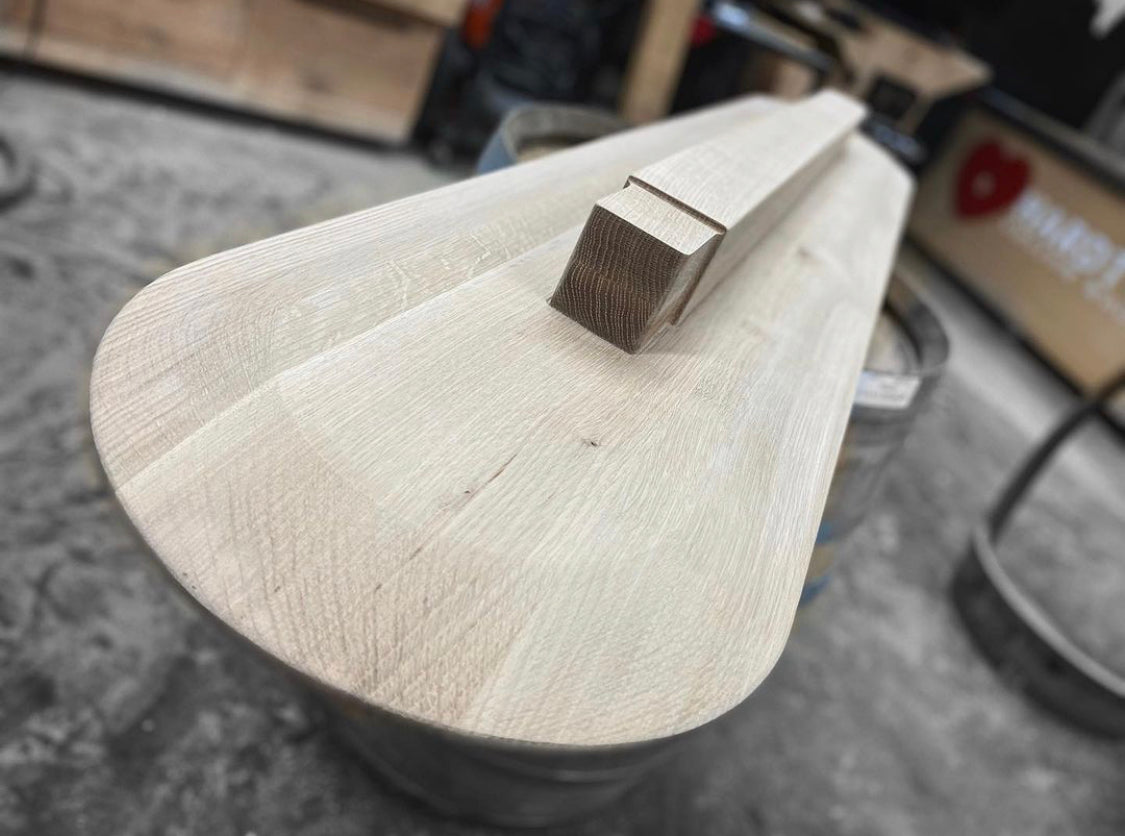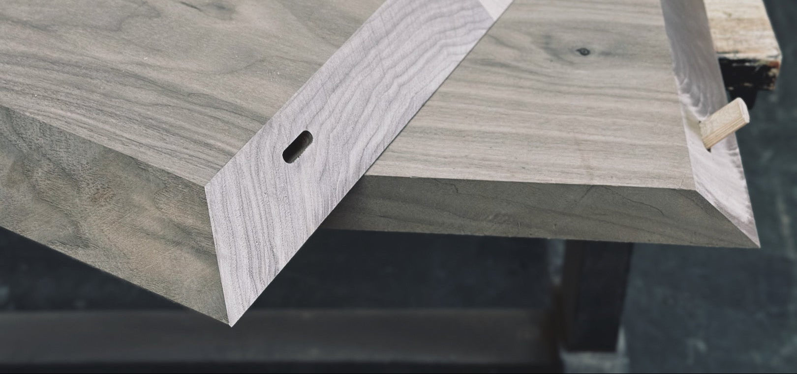 Designed in collaboration with Kiro Design and crafted by Formhaus, this custom white oak butcher block coffee table was created for the Skylark Rooftop Bar in New York City. The table features a sculpted silhouette with clean architectural geometry — a thick, angled-edge top resting on intersecting white oak panel legs that echo the material palette of the surrounding space.