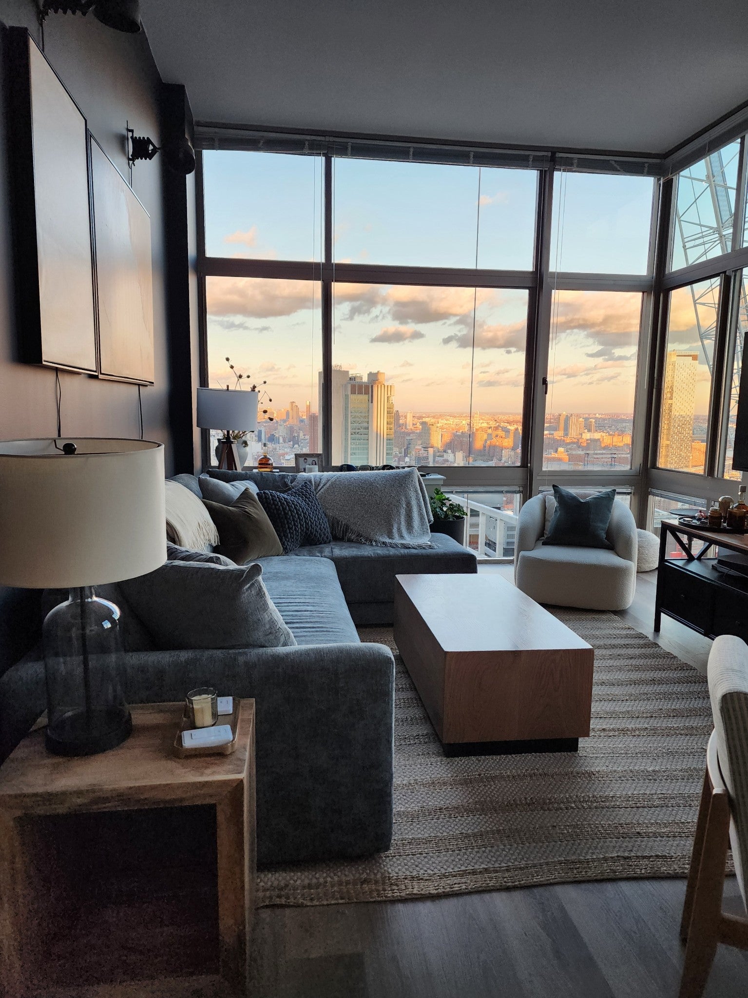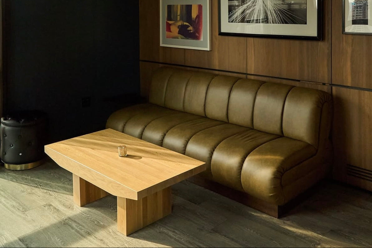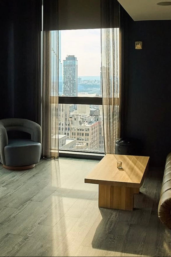Set against panoramic views of the Manhattan skyline, the piece embodies understated luxury and modern craftsmanship. Its solid white oak construction and natural matte finish bring warmth and balance to the sleek interior, making it both a focal point and a seamless extension of Skylark’s sophisticated atmosphere.