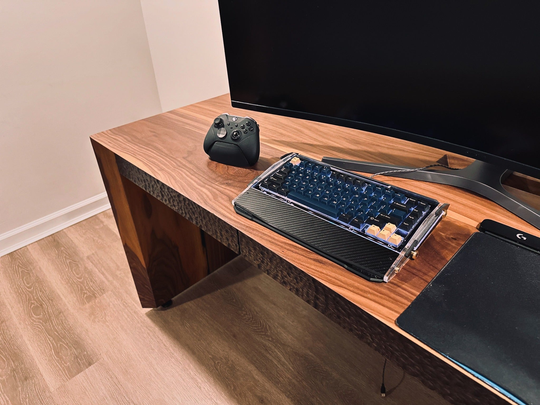 This custom Formhaus desk was designed for a private residence in Garden City, New York, combining modern geometry with handcrafted detail. Built from solid American Black Walnut, it features a seamless waterfall mitered profile and hand-carved drawer fronts that introduce a sculptural texture to the clean architectural form. The contrast between the smooth top and the chiseled drawer faces highlights the natural grain and depth of the wood, creating a refined yet artistic workspace centerpiece.